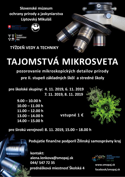 Podujatie s názvom /Týždeň vedy a techniky na Slovensku/ je každoročne organizované za účelom popularizácie vedy a zvýšenia záujmu o vedu a techniku u mladých ľudí na celom území Slovenska.Slovenské múzeum ochrany prírody a jaskyniarstva sa do aktivít Týždňa vedy a techniky zapája každoročne s podujatím /Tajomstvá mikrosveta/. Cieľom je popularizácia vedy spojená so zameraním múzea. Je zamerané na pozorovanie mikroskopických ale aj makroskopických preparátov z botaniky, zoológie ale aj mineralógie či paleontológie. Návštevníci si v tomto roku zblízka pozreli zloženie vtáčích pier, vývinové štádiá viacerých druhov živočíchov a rôzne paleontologické nálezy v našich zbierkach. Nahliadli tiež do chémie rastlinných farbív. Po výrobe vlastných preparátov mohli pozorovať mikroskopický, ale aj makroskopický život v našom jazierku.
